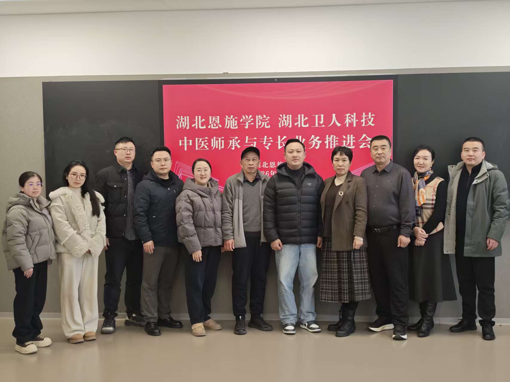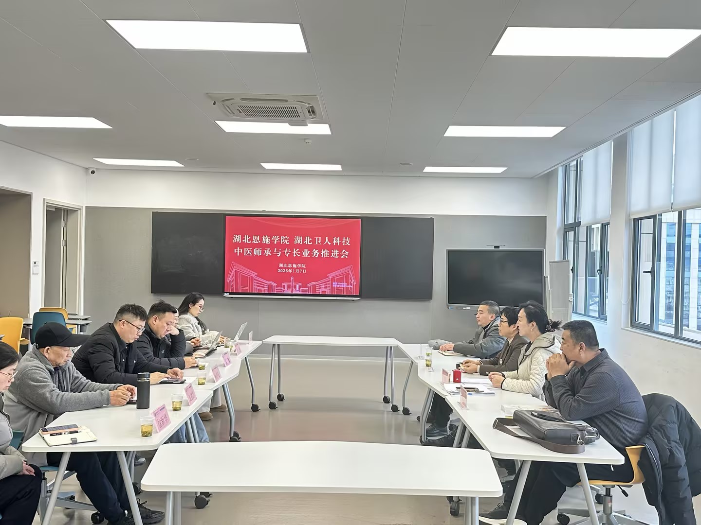 2025 年 1 月 8 日,湖北恩施学院与湖北卫人科技联合召开中医师承专长考培项目推进会。湖北恩施学院继续教育学院院长、副院长,医学部相关负责人,湖北卫人科技项目核心团队及行业专家代表齐聚一堂,以深化校企协同育人为核心目标,系统总结前期合作筹备进展,精准研判湖北省中医师承考培行业发展趋势,全面部署项目落地实施关键任务。
